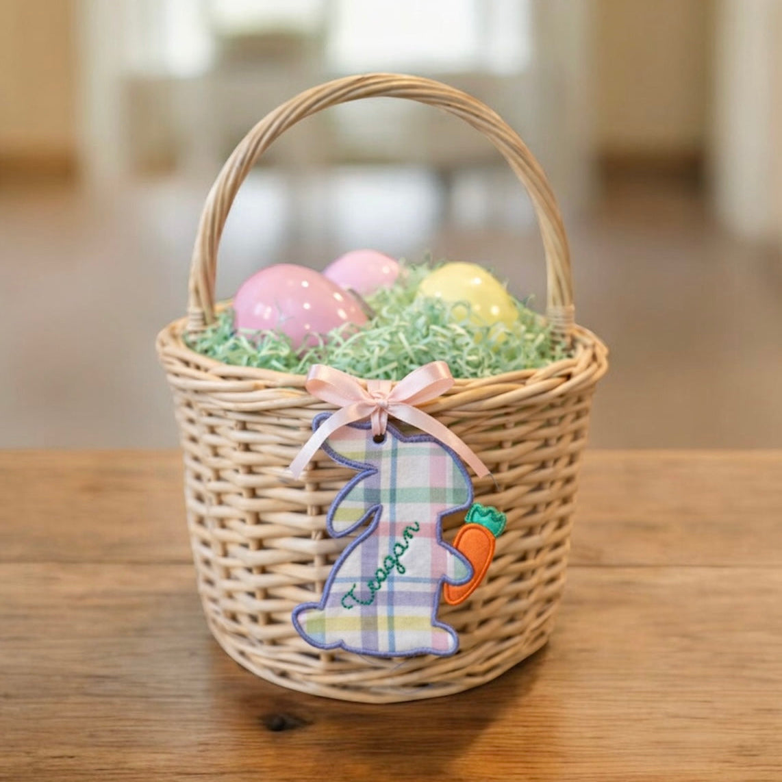 Shop herePersonalized name tag for your little one's Easter baskets. Designed with an appliqué bunny!