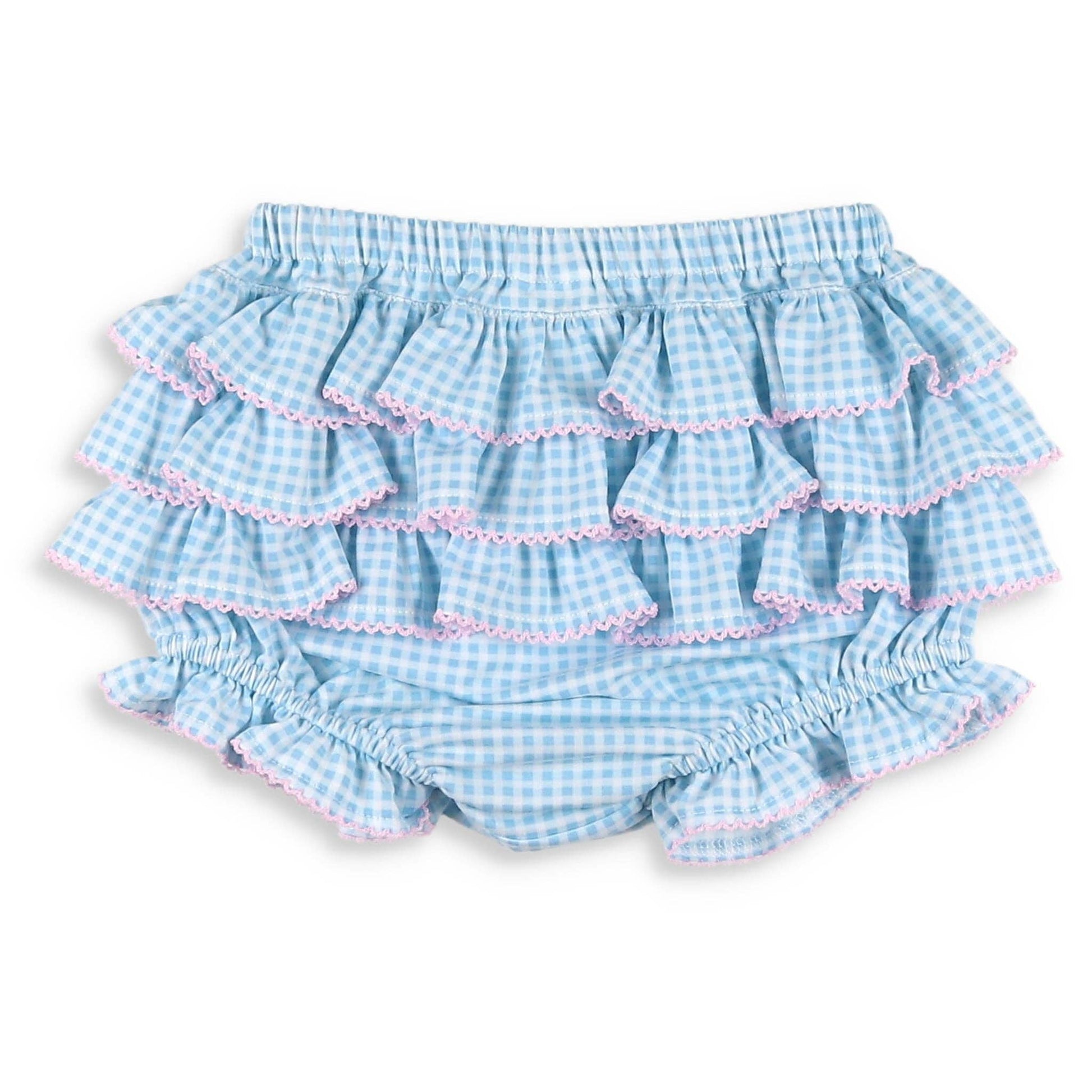 Dive into cuteness with our whimsical whale set! This charming outfit showcases blue and white gingham cotton fabric adorned with sweet pink picot trim along the arms, neckline, and hem. The bloomers feature three playful ruffle rows and adorable ruffle legs, while a pink applique whale face adds the charming final touch. Shoulder buttons and a cross-back design create a spirited, vintage-inspired look that's perfect for your little one's adventures!