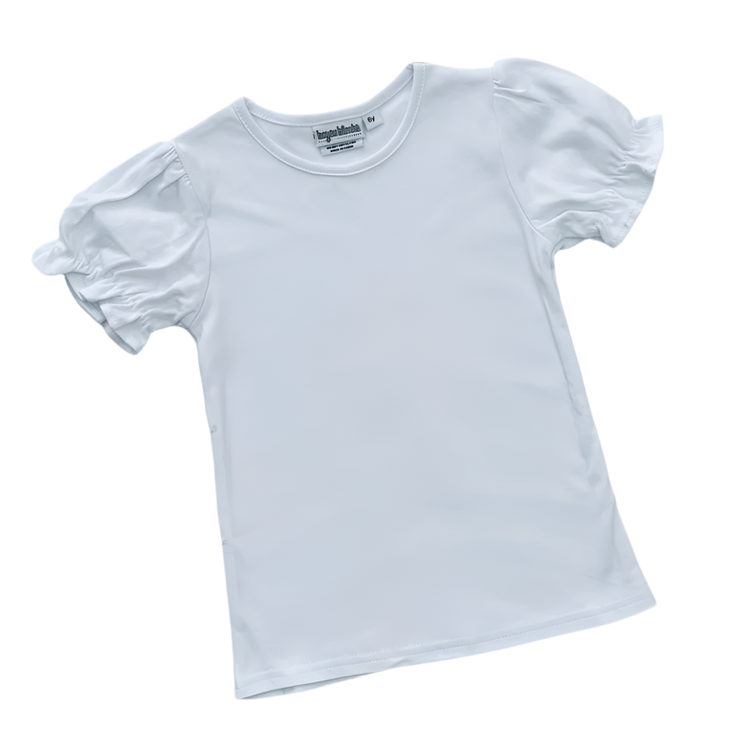 New girl's white t-shirt! Made of 100% cotton and cute ruffles on the sleeves. Add any design of your choice to make it uniquely yours!